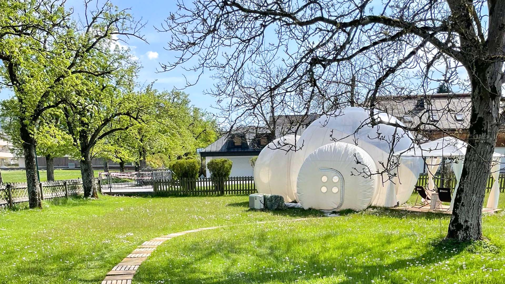 Das Kernstück dieses Erlebnisses ist das innovative Bubble Tent. Dieses aufblasbare, transparente Kuppelzelt bietet Ihnen einen 360-Grad-Blick auf die umliegende Natur und den Sternenhimmel. Die Konstruktion ist robust und wetterbeständig, während die durchsichtige Hülle Ihnen ein Gefühl von Freiheit und Verbundenheit mit der Natur vermittelt. Bei Einbruch der Dunkelheit verwandelt sich Ihr Schlafplatz in ein privates Observatorium, das den Blick auf Millionen von Sternen freigibt. Tagsüber genießen Sie den Panoramablick auf die idyllische Landschaft Weyreggs und die erhabene Kulisse des Attersees.