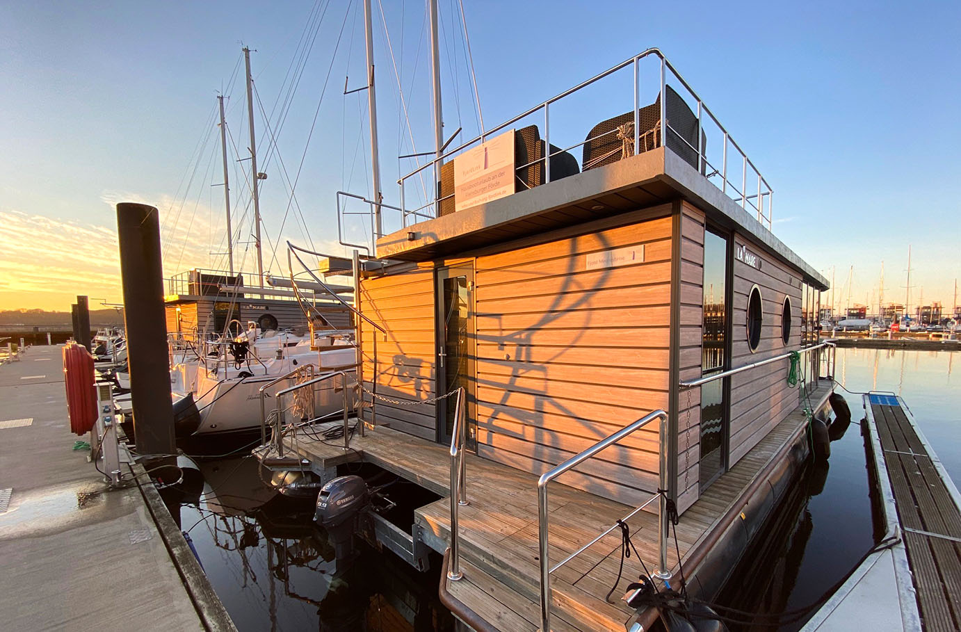 | Hauptmaterialien (Aufbau) | Hochwertige Marine-Verbundwerkstoffe und wetterbeständiges Holz für Langlebigkeit und ästhetische Integration ins maritime Umfeld. Isolierte Sandwichpaneele gewährleisten ganzjährigen Komfort. |