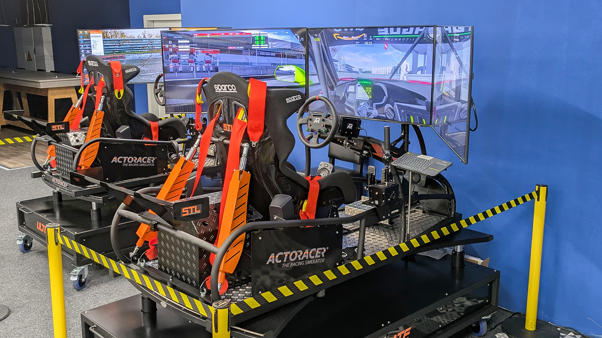 | Simulationshardware | Professionelles Cockpit mit immersiven Bewegungen, das Beschleunigungs-, Brems- und Kurvenkräfte realistisch simuliert. Ergänzt durch präzise Force-Feedback-Lenkräder für authentisches Fahrgefühl. |