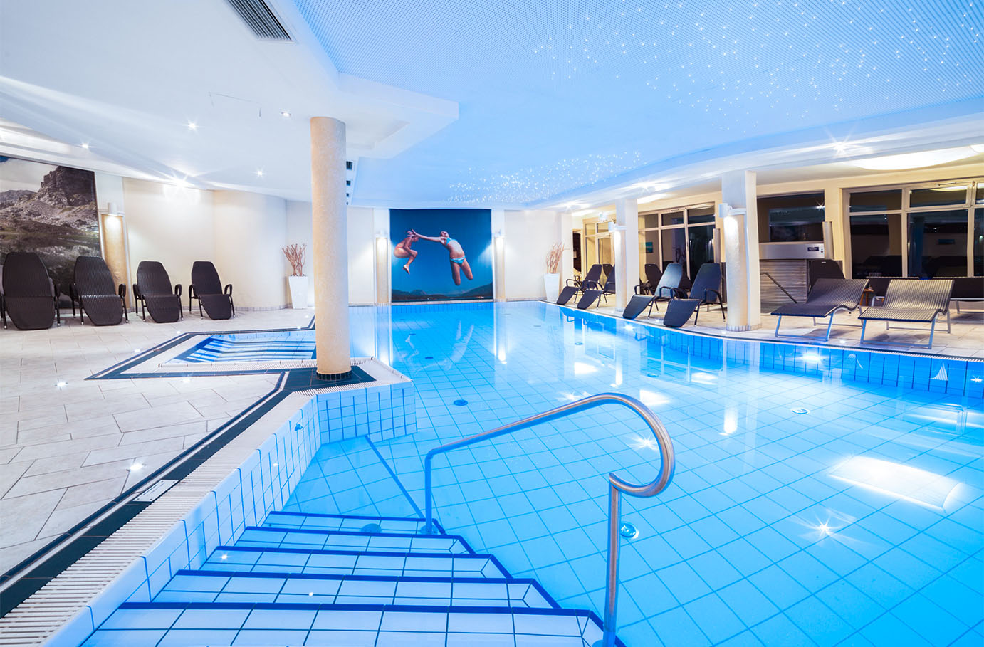 | Wellnessbereich | Umfasst typischerweise Schwimmbäder (Innen-/Außenbereich), verschiedene Saunen (Finnische Sauna, Dampfbad, Infrarotkabine), Ruheräume und oft spezielle Themen-Saunen. Zugang ist in der Regel ab 16 Jahren gestattet. |